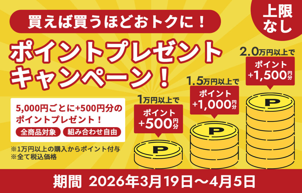 税込10,000円以上ご購入のお客様に通常ポイントに追加で500円分のポイントをプレゼント。さらに購入金額が5,000円上がるごとに、プレゼントポイントが500円分ずつアップします。上限なしなので、まとめ買いがとってもお得です!